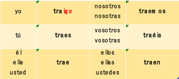 例)traer(~を持ってくる、(人を)連れてくる、身につけている)