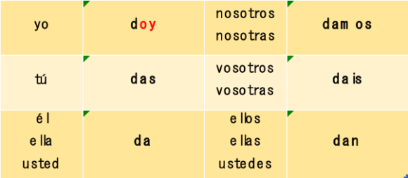 :1人称単数の語尾で-arを-oyに置き換え、他の人称では規則変化動詞と同様の活用をします。